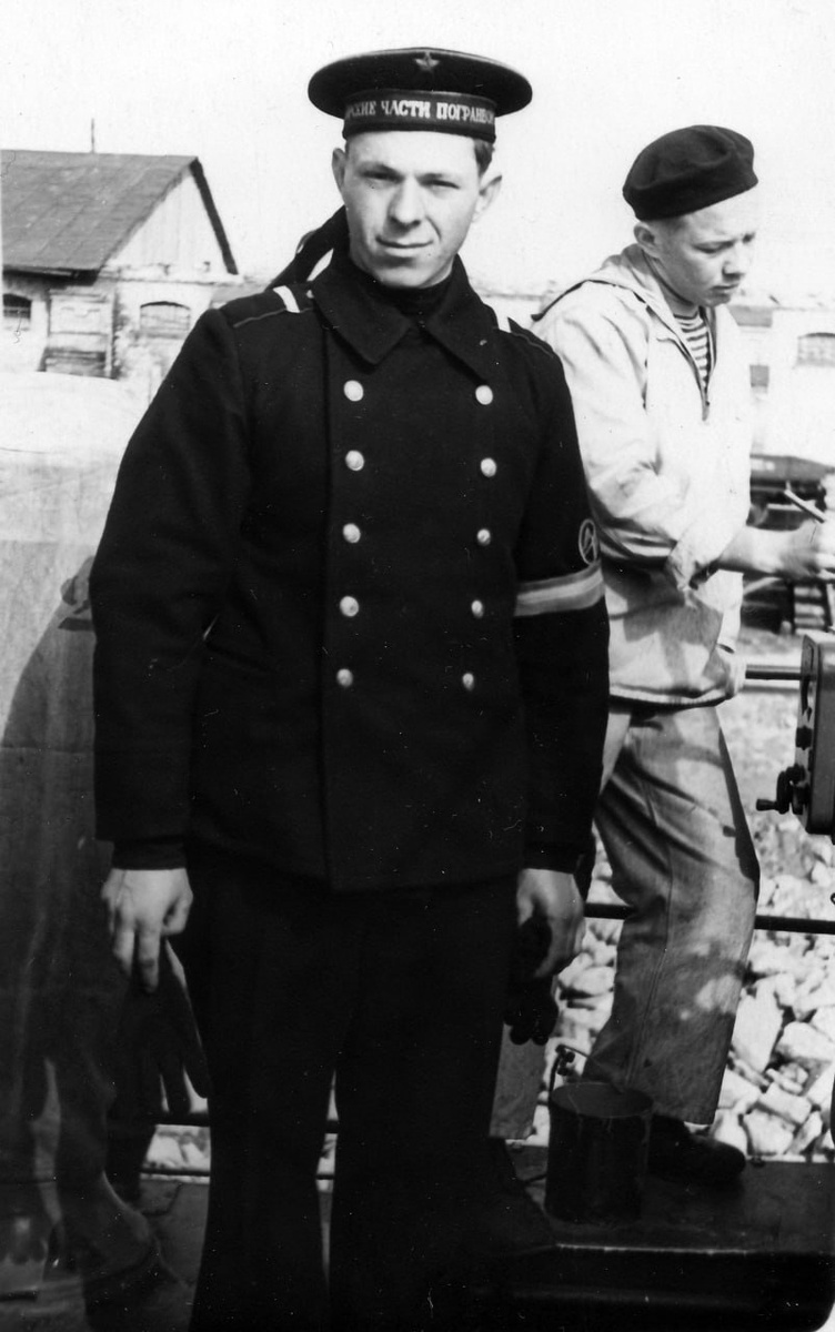 1943 года с зелеными кантами. Нарукавный штат - "сигнальщика". У старшего матрос суконная черная бескозырка с лентой - "МОРСКИЕ ЧАСТИ ПОГРАНВОЙСК". Источник: отсканированная фотография из личной коллекции. #фото #МЧ_ПВ #ПВ #КГБ