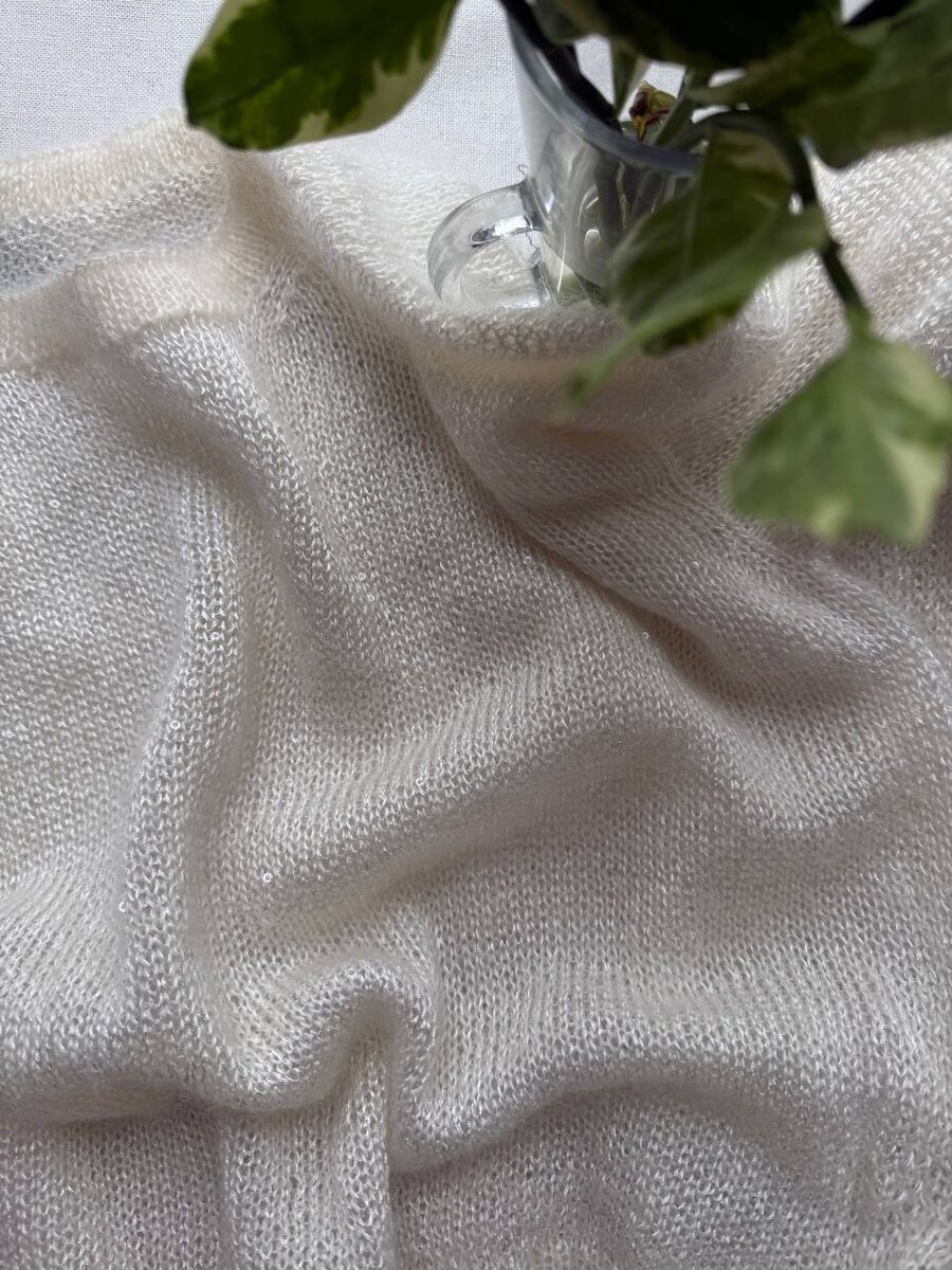 В полотне - мохер Silk mohair с пайетками Paillettes. Это пайетки на полиамидной основе. Нить дает дополнительный блеск, сама пайетка мелкая. Полотно получается как с глиттером. Если хочется понатуральнее и не такое блескучее, выбирайте Raffinato.