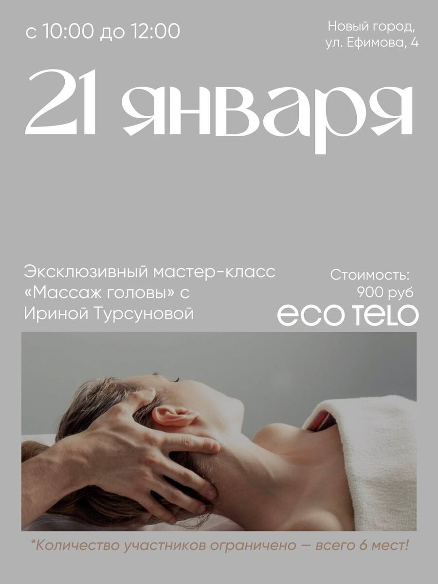 Эксклюзивный мастер-класс «Массаж головы» с Ириной Турсуновой Мы приглашаем вас на камерный мастер-класс, посвящённый глубокому расслаблению и заботе о себе. 📅 21 января 🕙 10:00–12:00 📍 Новый город, ул. Ефимова, 4 💰 900 руб. 👥 Всего 6 участников — чтобы сохранить внимание к каждому На встрече вы: • освоите мягкие техники массажа головы, которые помогают снять напряжение и стресс • познакомитесь с авторскими приёмами, доступными только в этом году • почувствуете, как тело и мысли становятся спокойнее уже во время практики Это пространство для замедления, восстановления и тонкой работы с состоянием. Количество мест ограничено, и сейчас свободно всего несколько. 📩 Запись через администратора @Eco_Telo_NG