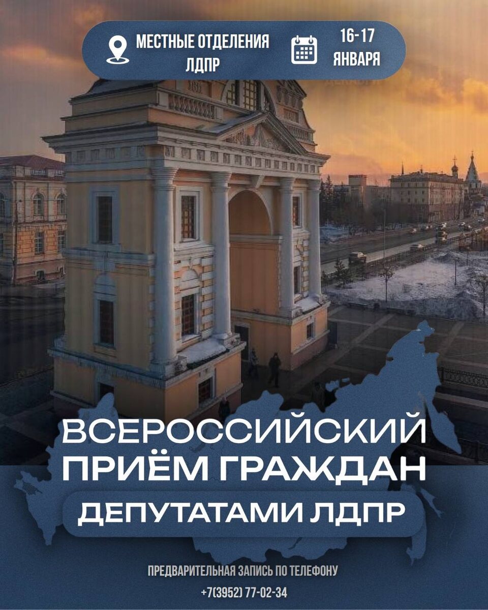 ! 📝16–17 января жители региона смогут посетить общероссийский приём граждан. 💬Каждый желающий сможет лично обратиться к депутатам, рассказать о своих вопросах и инициативах. Все обращения будут записаны и переданы в профильные ведомства. ✅Уточнить адреса площадок и время приёма можно в региональном отделении ЛДПР или по телефону: 8 (3952) 770‑234.
