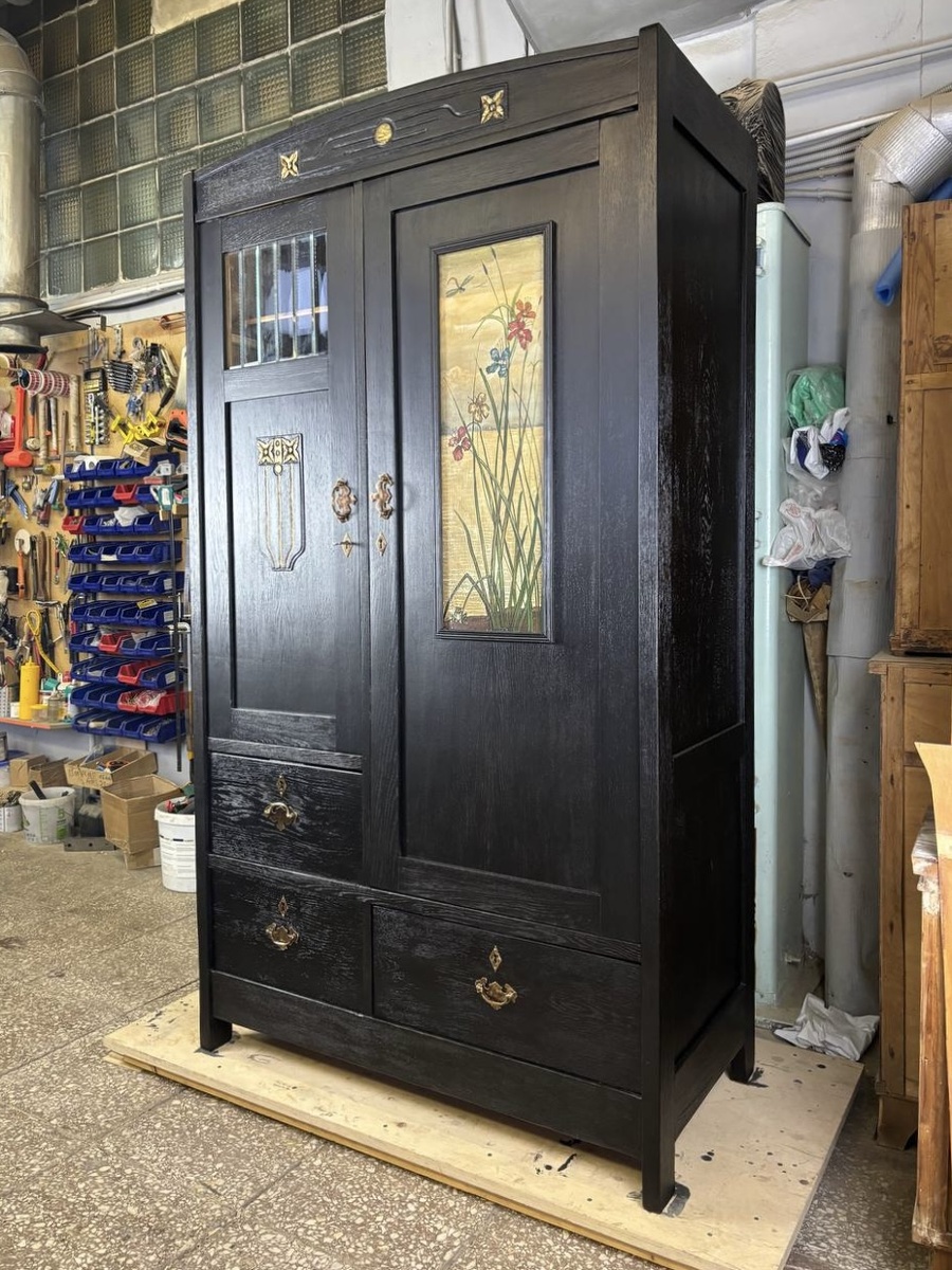 К нам поступил шкаф производства «3-я Ленинградская мебельная фабрика "СОЮЗМЕБЕЛЬ"». Его дубовый шпон был скрыт под толстым слоем старой черной краски. Заказчик хотел оставить шкаф черным, но сделать цвет благородным и аккуратным.