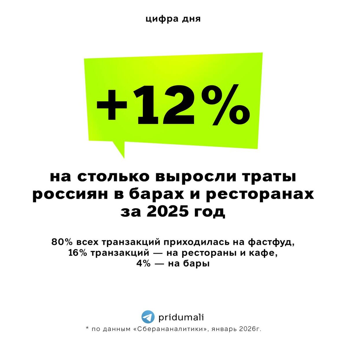 В рубрике «Цифра дня» данные СБЕРАНАЛИТИКИ — на 12% выросли траты россиян в ресторанах и барах. Главным драйвером роста стала не частота посещений, а увеличение среднего чека. При этом число посетителей мест общепита увеличилось всего на 2%. Большую часть всех гостей заведений общепита в прошлом году составили люди 35-44 лет (34%). 54% всех посетителей — женщины. 👉подписаться на @pridumali #исследования