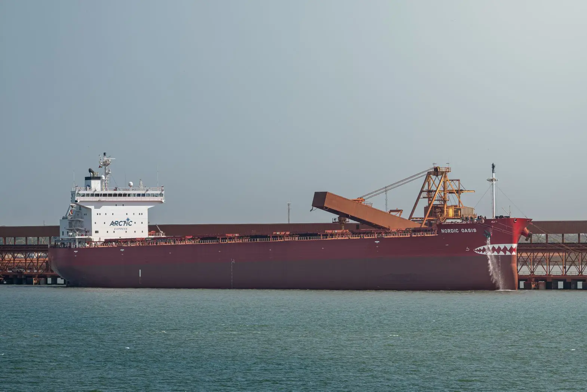 Балкер NORDIC OASIS в один из моментов своей работы: под погрузкой сырья у причала в водах Атлантики. Длина судна составляет 225 м, ширина — 32 м, дедвейт — 75 800 т, класс — Panamax. Судно выделяется ярким цветом корпуса и характерным «оскалом» в районе носовой части. Присмотритесь.