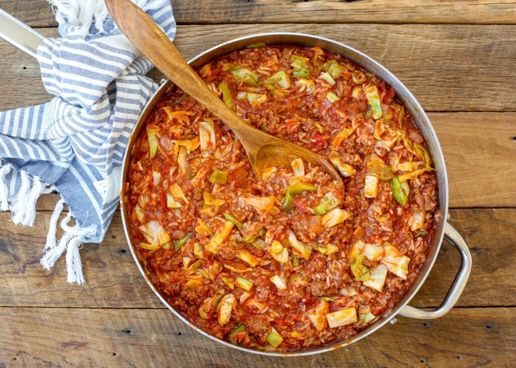 1. Ленивые голубцы в сковороде (≈450–500 ₽ на 4 большие порции, 25 минут)