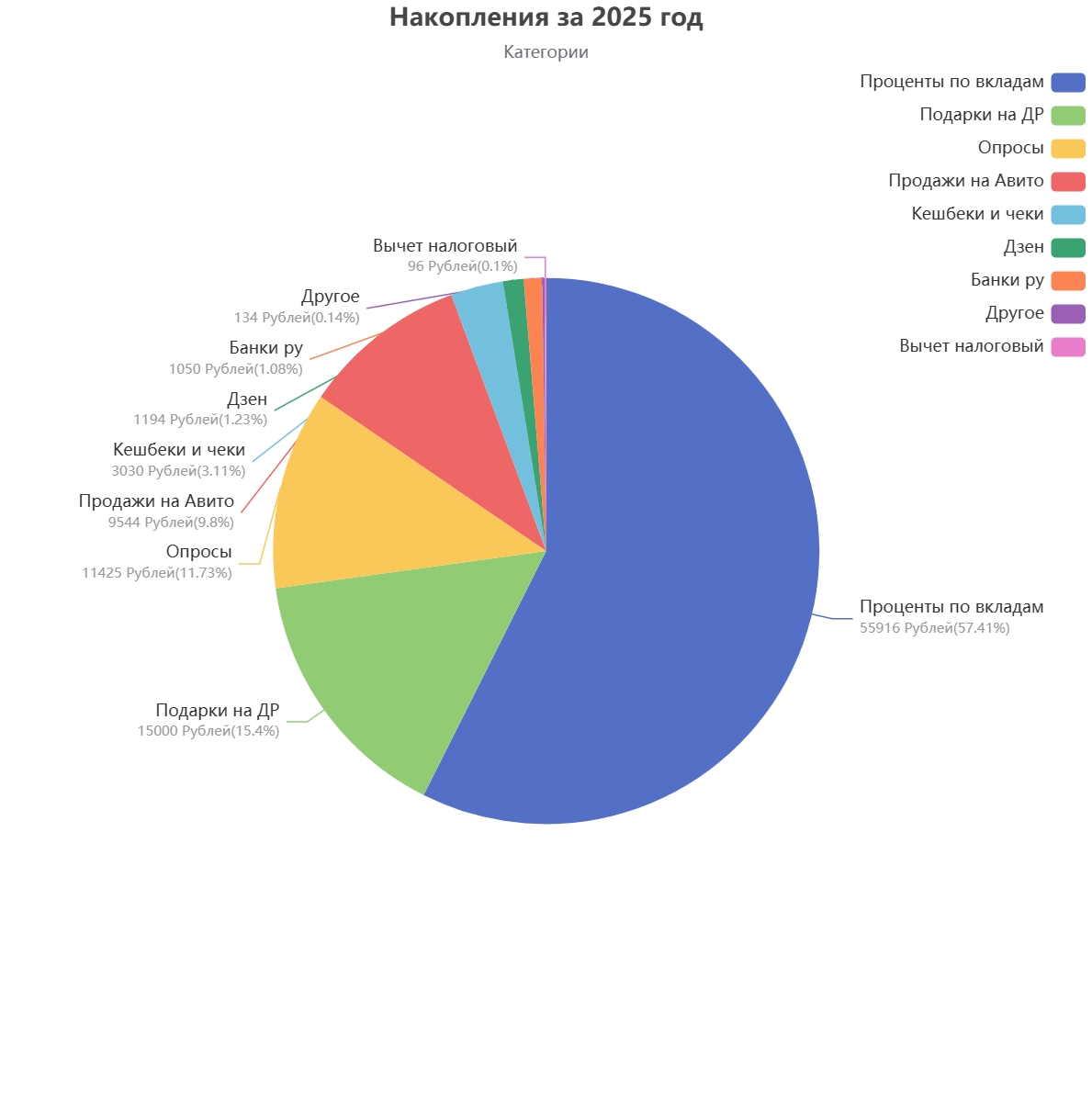 Всем привет! Вот и обещанная статья о категориях подробно в рамках моего накопительного челленджа, длившегося целый 2025 год Я достигла цели в 330 000 рублей, выйдя на сумму в конце года в 332 тысячи рублей, что считаю очень крутым результатом для себя. В этой статье хочу более подробно рассмотреть, что же мне помогло накопить эту сумму за год. Для большей наглядности сделала круговую диаграмму: На этом все, такие небольшие активности в интернете дали мне такой результат. Для кого-то это мало, а для кого-то много. Для меня так. И хоть я не достигла желаемой суммы в 115 000 рублей, иметь чуть больше 97 000 тоже считаю очень и очень неплохо.