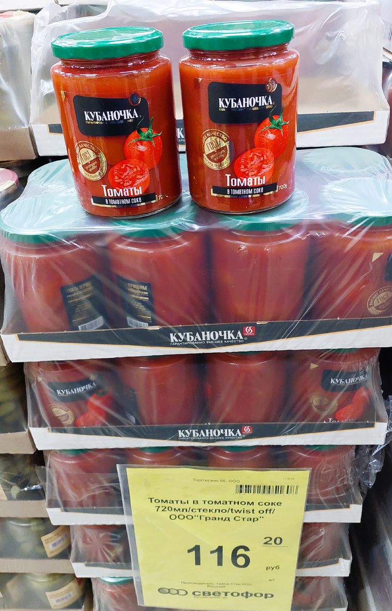 Впервые встречаю в Светофоре такое, будто домашнее консервирование от "Кубаночка" - "Томаты в томатном соке". Понравился состав: томаты; томатный сок; соль и лимонная кислота. Не содержат консервантов, искусственных красителей и ароматизаторов. Томаты в томатном соке подходят для приготовления соусов, рагу, супов и других блюд. Объем 720 мл по цене 116,2 рублей. Произведено в Краснодаре.