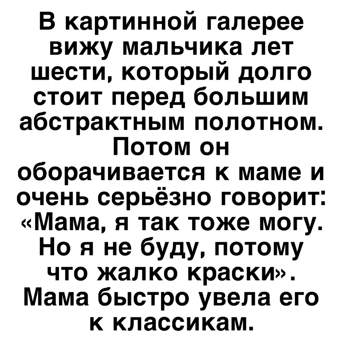 В картинной галерее вижу мальчика лет шести, который долго стоит перед большим абстрактным полотном. Потом он оборачивается к маме и очень серьёзно говорит: «Мама, я так тоже могу. Но я не буду, потому что жалко краски». Мама быстро увела его к классикам.