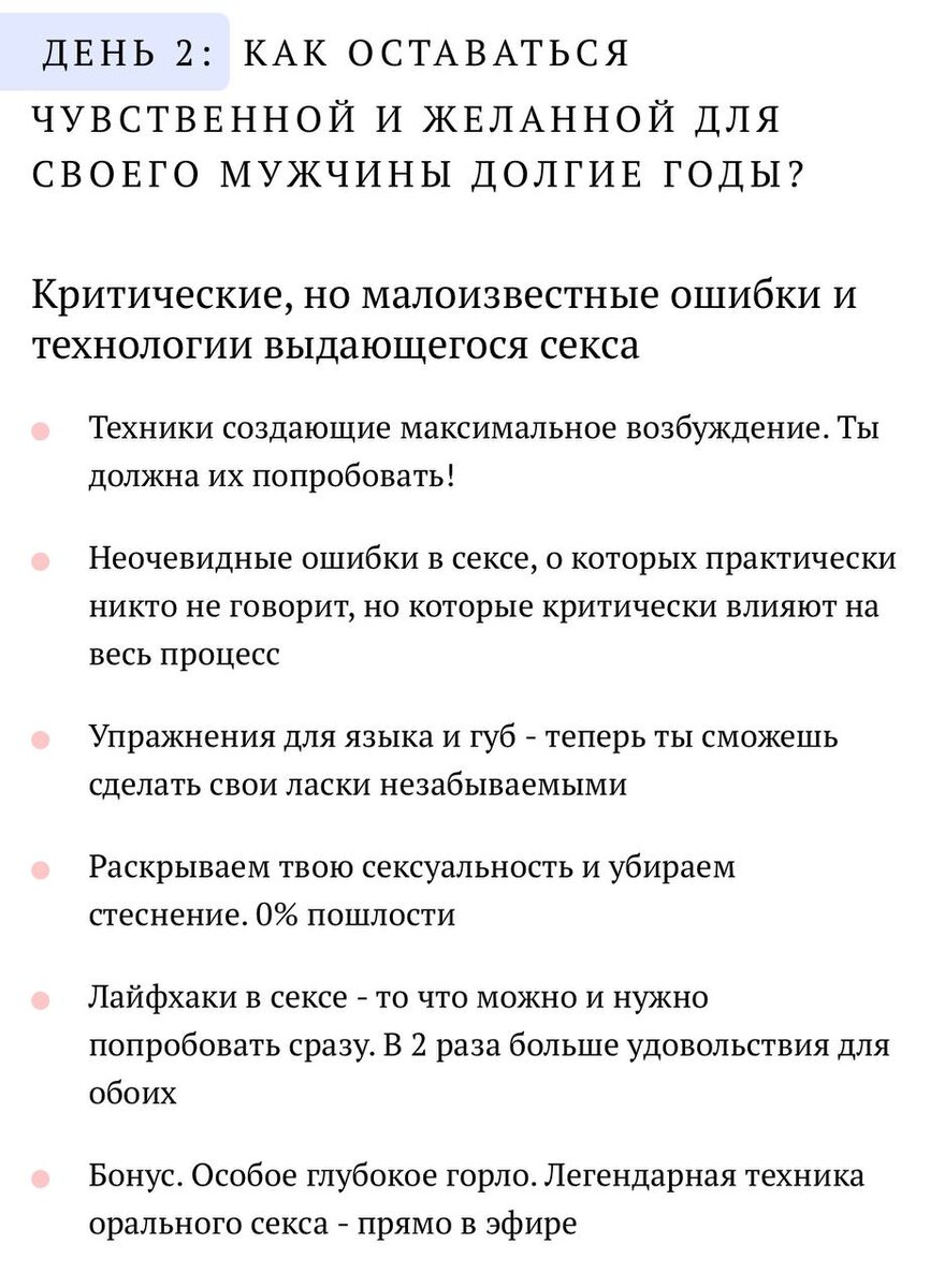 Самая страшная ошибка для любой женщины - это профукать свои годы впустую! То есть терпеть, а потом понять что можно было жить по другому. Но годы прошли и уже ничего не хочется. А в душе горечь - «Не получилось… ошиблась…все зря» Вот это самое страшное! Начав сейчас раскрывать свое сексуальное мастерство ты через год увидишь как жизнь кардинально изменится. После секса ухажеры не будут пропадать. Ты начнешь получать максимум удовольствия от интима. Твой мужчина будет вкладываться и ценить тебя. Потому что твоя сексуальность выйдет на пиковые показатели. При том что ты обычная нормальная женщина. Но начать надо сейчас. Многие мои ученицы пишут эта фразу «…жалею что не начала раньше… мне бы эти знания раньше…» Время не вернуть. Поэтому я приглашаю тебя на 2й день онлайн марафона «Единственная Желанная»! Мы с Екатериной Федоровой подготовили массу новых техник в постели. Разберём твои ошибки, дадим вау-фишки которые можно попробовать сразу без подготовки и многое другое! Программа на с