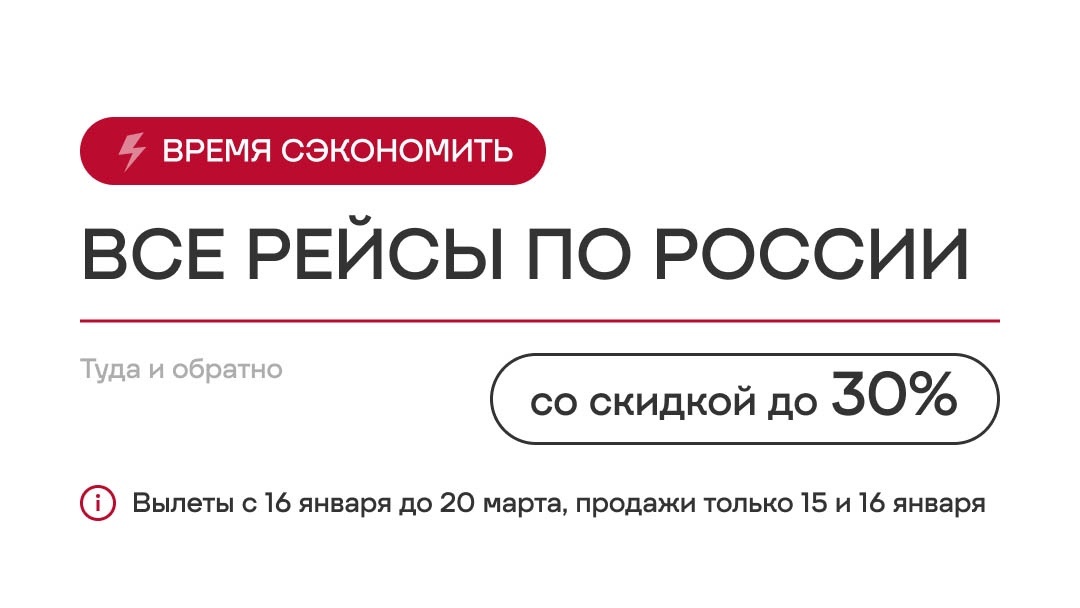 Только сегодня и завтра — скидка до 30% на все рейсы по России при покупке билетов «туда-обратно»! Период вылетов: с 16 января по 20 марта. Период продаж: только 15 и 16 января. Зима — отличный повод увидеть знакомые города с новой стороны: ❤️ Сочи с его зимними трассами, ❤️ Калининград с заснеженными европейскими улочками, ❤️ Байкал с легендарным прозрачным льдом и еще десятки окрыляющих направлений. ❗️ Скидка действует только при покупке билетов туда и обратно в одном бронировании. Билеты — на нашем сайте, в мобильном приложении, контакт-центре и других каналах продаж. Предложение ограничено.