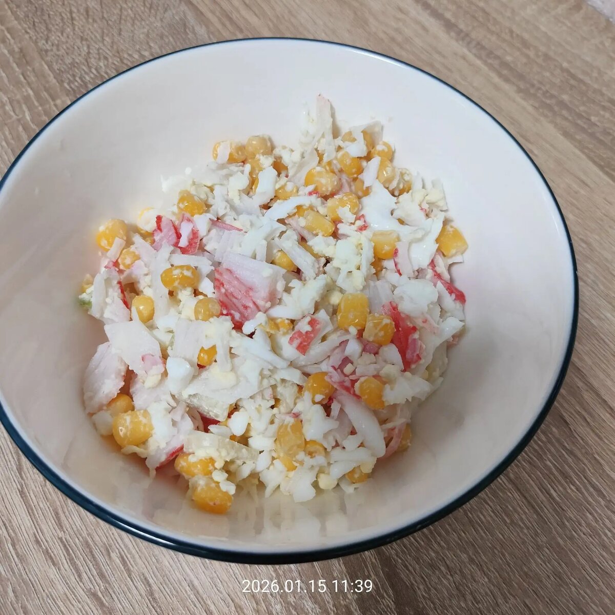 - Смешивание: В глубокой миске смешайте нарезанные крабовые палочки, яйца и кукурузу и лук.