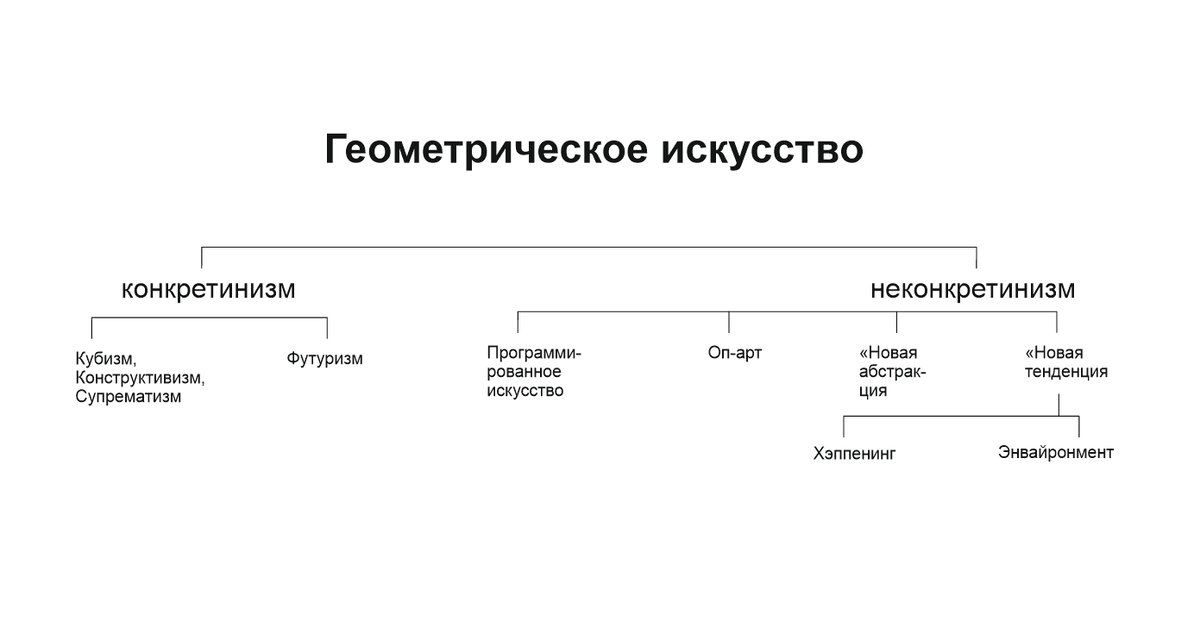 Геометрическое искусство – первое по времени в истории искусства ХХ в. почти полностью нефигуративное искусство. Внутри этого направления прошел второй путь к беспредметному искусству через строгий, почти математический расчет композиции работ. Направление не было единым ни по времени, ни по методам работы, и в нем объединены достаточно разнородные явления – от кубизма до хэппенинга. Между его разновидностями (поднаправлениями) «конкретизмом» и «неоконкретизмом» временной интервал примерно в 25-30 лет.