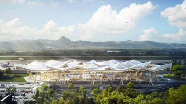 Проект нового пассажирского терминала в столице Республики Алтай получил положительное заключение Главгосэкспертизы. Строительство пройдёт на территории действующего международного аэропорта в Майминском районе без остановки его работы. Главной особенностью нового трёхэтажного здания площадью более 28 тысяч кв. метров станет крыша в форме алтайских горных вершин и панорамные витражи по фасадам. Вместе с терминалом обновят привокзальную площадь и инженерную инфраструктуру. Инф. и фото: Канал Сибирский. Новостной