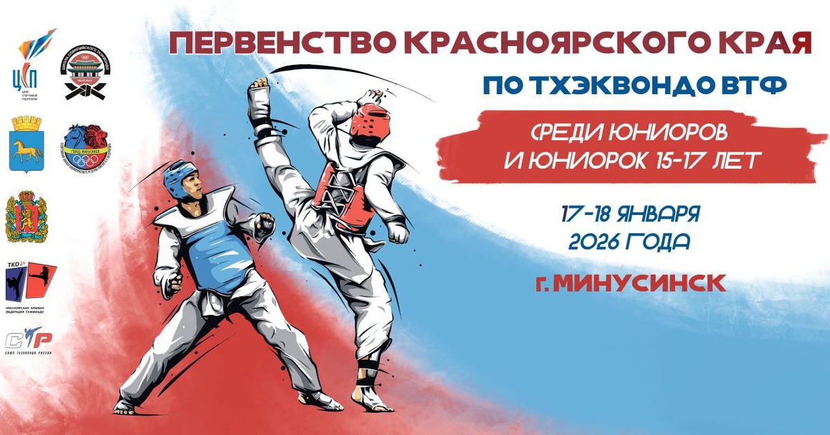 ! С 17 по 18 января в Минусинске пройдет первенство Красноярского края по тхэквондо среди юниоров и юниорок 15-17 лет. Победители получат право участвовать в первенстве Сибирского федерального округа. Место проведения - спортивный комплекс имени Ю.В. Шумилова, ул. Свердлова, 105. Торжественная церемония открытия 17 января в 13:00, начало соревнований 17 и 18 января в 10:00 Спортивная школа олимпийского резерва имени В.П. Щедрухина приглашает всех желающих поддержать наших спортсменов! Не упустите возможность увидеть захватывающие поединки!