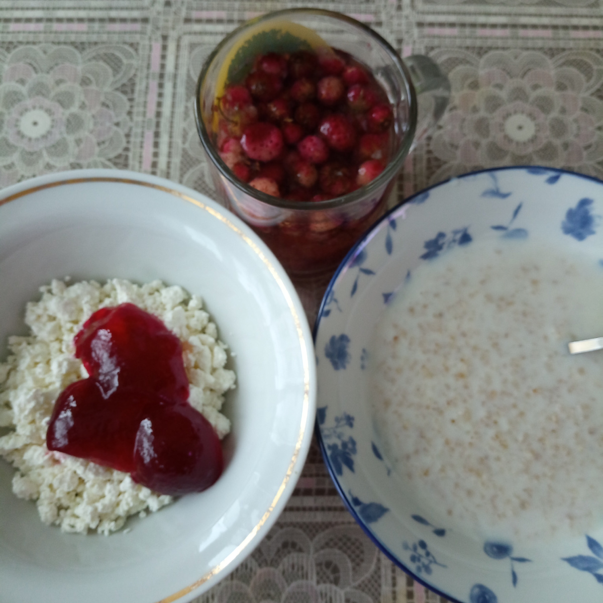 Приготовила кашу из новой упаковки. Эти хлопья оказались тем, что мне как раз и хотелось. Надо будет купить несколько упаковочек про запас. Творог доедаю ещё тот, который покупала два дня назад. В упаковке 350 г, мне хватает на три, а то и четыре раза. Ещё остался на разок. Вместо чая заварила полевую клубнику.