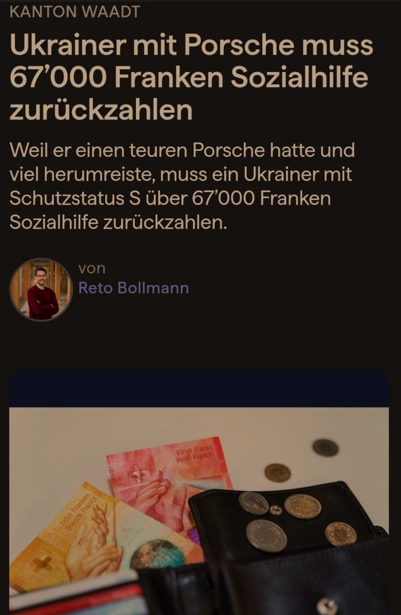 ΠΏΡΠΈΠ½ΡΠΈΠΏΠ° ΡΠ°Π²Π½ΠΎΠ³ΠΎ ΠΎΠ±ΡΠ°ΡΠ΅Π½ΠΈΡ Ρ Π΄ΡΡΠ³ΠΈΠΌΠΈ ΠΏΠΎΠ»ΡΡΠ°ΡΠ΅Π»ΡΠΌΠΈ ΡΠΎΡΠΏΠΎΠΌΠΎΡΠΈ Π°Π²ΡΠΎΠΌΠΎΠ±ΠΈΠ»ΠΈ ΡΡΠΈΡΠ°ΡΡΡΡ ΠΈΠΌΡΡΠ΅ΡΡΠ²ΠΎΠΌ, ΠΊΠΎΡΠΎΡΠΎΠ΅ ΠΏΠΎΠ΄Π»Π΅ΠΆΠΈΡ ΠΎΡΡΡΠΆΠ΄Π΅Π½ΠΈΡ. ΠΠ΄ΠΈΠ½ ΡΠΊΡΠ°ΠΈΠ½Π΅Ρ Ρ ΡΠ°Π·ΡΠ΅ΡΠ΅Π½ΠΈΠ΅ΠΌ S ΡΠ·Π½Π°Π» ΠΎΠ± ΡΡΠΎΠΌ Π½Π° ΡΠΎΠ±ΡΡΠ²Π΅Π½Π½ΠΎΠΌ ΠΎΠΏΡΡΠ΅: ΠΎΠ½ Π΄ΠΎΠ»ΠΆΠ΅Π½ Π²Π΅ΡΠ½ΡΡΡ Π²ΡΡ ΡΠΎΡΠΈΠ°Π»ΡΠ½ΡΡ ΠΏΠΎΠΌΠΎΡΡ, ΠΏΠΎΠ»ΡΡΠ΅Π½Π½ΡΡ Ρ ΠΌΠΎΠΌΠ΅Π½ΡΠ° ΠΏΡΠΈΠ±ΡΡΠΈΡ Π² ΡΡΡΠ°Π½Ρ, ΠΏΠΎΡΠΊΠΎΠ»ΡΠΊΡ Π²Π»Π°Π΄Π΅Π» Porsche Cayenne ΠΈ ΡΠΎΠ²Π΅ΡΡΠ°Π» Π΄ΠΎΡΠΎΠ³ΠΈΠ΅ ΠΏΠΎΠ΅Π·Π΄ΠΊΠΈ, ΡΠΎΠΎΠ±ΡΠ°Π΅Ρ Π³Π°Π·Π΅ΡΠ°. ΠΡΠΆΡΠΈΠ½Π°, ΠΎΠΊΠΎΠ»ΠΎ 45 Π»Π΅Ρ, ΠΏΡΠΈΠ±ΡΠ» Π² Π¨Π²Π΅ΠΉΡΠ°ΡΠΈΡ Π»Π΅ΡΠΎΠΌ 2022 Π³ΠΎΠ΄Π° ΠΈ Π±ΡΠ» ΡΠ°ΡΠΏΡΠ΅Π΄Π΅Π»ΡΠ½ Π² ΠΊΠ°Π½ΡΠΎΠ½ ΠΠΎ. ΠΠ²Π° Π³ΠΎΠ΄Π° ΡΠΏΡΡΡΡ ΠΊΠ°Π½ΡΠΎΠ½Π°Π»ΡΠ½ΠΎΠ΅ ΡΠΏΡΠ°Π²Π»Π΅Π½ΠΈΠ΅ ΡΠΎΡΠΈΠ°Π»ΡΠ½ΠΎΠ³ΠΎ ΡΡΡΠ°Ρ