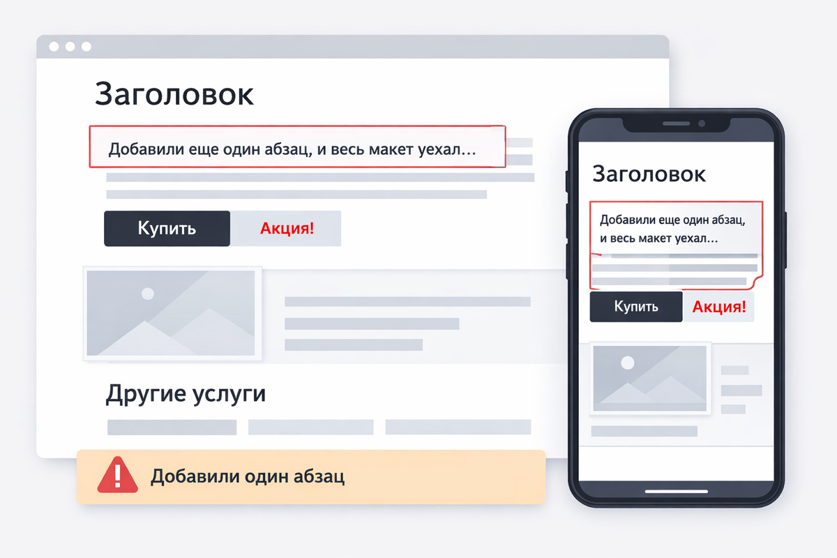 Вы заказываете сайт. Всё готово, работа сдана. И тут… хочется немного поправить текст. Казалось бы — ерунда. Но дизайнер выставляет счёт. «Я же уже всё оплатил. Почему за маленькие правки нужно доплачивать?» Разбираемся, откуда берётся цена «просто поправить текст» — и как сэкономить без потерь. Когда вы говорите «тут надо немного скорректировать текст», дизайнеру нужно: Это не 2 минуты. Это полноценный блок работы. Я делала вёрстку сайта по предоставленному макету, и на этапе адаптации для мобильных устройств выяснилось, что клиент внёс правки только в одну версию: на десктопе остался старый текст, а в мобильной — новый. Пришлось всё перепроверять и переделывать верстку. Я даже выкладывала момент этого кейса в видео на YouTube — там видно, как одно «незначительное» изменение выливается в полноценную доработку. В процессе работы над сайтом текст согласовывается заранее — на этапе прототипа. Это делается не просто так, а чтобы избежать множества доработок и лишних затрат на финальной с
