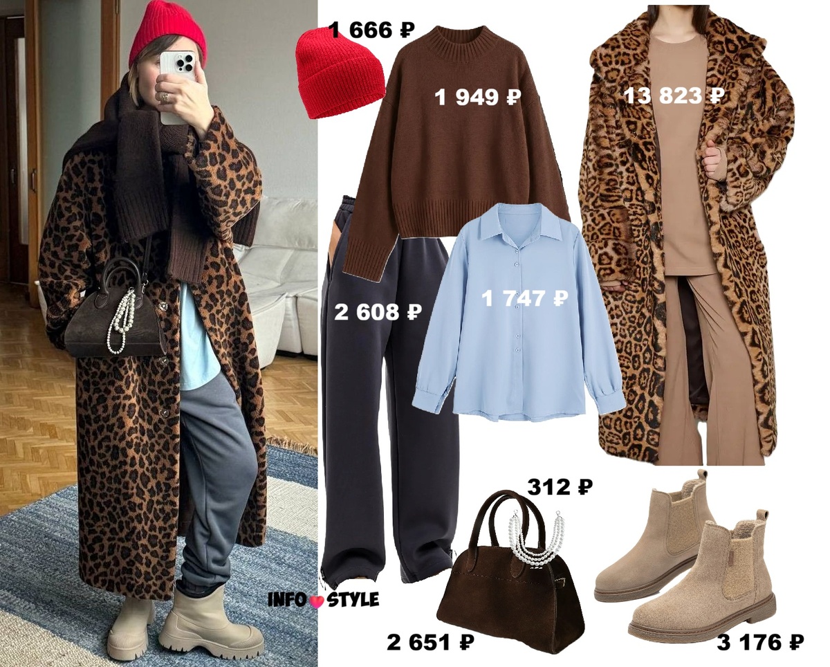 Всем привет! Благодарю, что заглянули на канал Рубрика: покупки и подборки На канале 👉ТГ👈 много интересных подборок🔥 И вновь очередная подборка образов из Pinterest, которые способны вдохновить каждую из нас, но приобрести вещи с фото потенциально проблематично по ряду причин (многие бренды ушли с российского рынка). Воспроизводить же образы из Pinterest с помощью WB на самом деле не так просто, ибо на маркетплейсе самые ходовые размеры исчезают достаточно быстро, да и фактический цвет той или иной вещи предсказать проблематично. Особенно не радует, что продавцы перешли на формат фото товара, сделанные с помощью искусственного интеллекта, делающего их эталонными, хотя реальность куда более прозаична. На ТГ канале такие образы-подборки появляются раньше, чем на Дзене 🫶 Шубка с леопардовым принтом смотрится более повседневно, если в качестве низа к ней добавить спортивные брюки и утеплённые ботинки-челси (или угги). 🟤 Шуба 🟤 Джемпер 🟤 Рубашка 🟤 Брюки 🟤 Сумка 🟤 Обвес 🟤