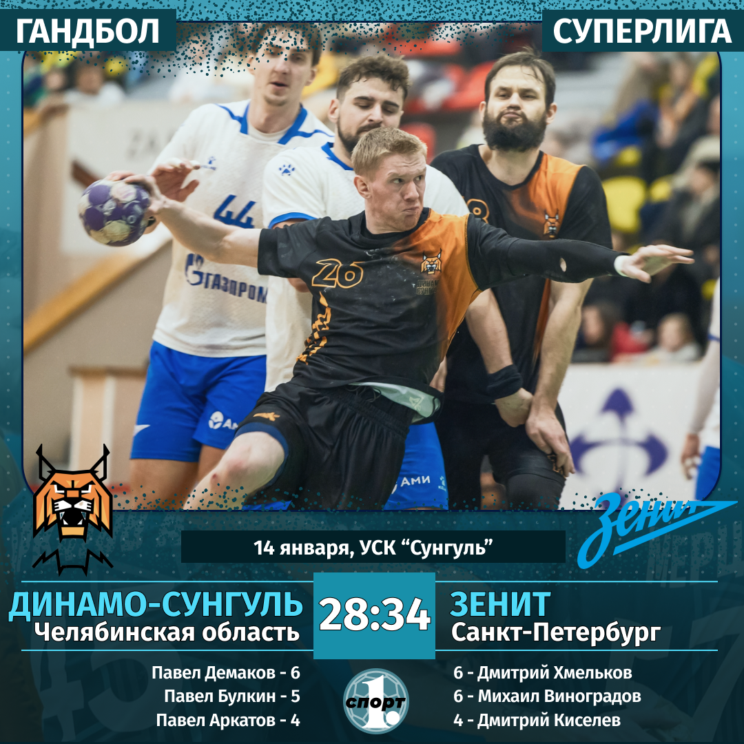В гандбольной Суперлиге достойный отпор действующему чемпиону турнира оказала команда «Динамо-Сунгуль». Южноуральцы на своей площадке уступили питерскому «Зениту» со счетом 28:34. Они продолжают идти в группе лидеров турнира и с высокой долей вероятности выйдут в плей-офф, сообщает корреспондент ИА «Первое областное». Гандболисты клуба «Динамо-Сунгуль» в очередном туре Суперлиги принимали на своей площадке в Снежинске действующего чемпиона. Мало того что питерский «Зенит» является главным претендентом турнира, так еще набрал хорошую форму: одержал шесть побед подряд и вплотную приблизился к лидеру — «Пермским медведям». Хозяева площадки провели неплохой матч, заставив соперника понервничать. В первом тайме игроки «Динамо-Сунгуля» отвечали атакой на атаку. Наши ребята хотя и вынуждены были догонять соперника, но не давали уходить ему в отрыв. В итоге 12:16 по итогам первой половины матча. Достойно сражались южноуральцы и во втором тайме. Но класс и мастерство питерцев сказались. В соста
