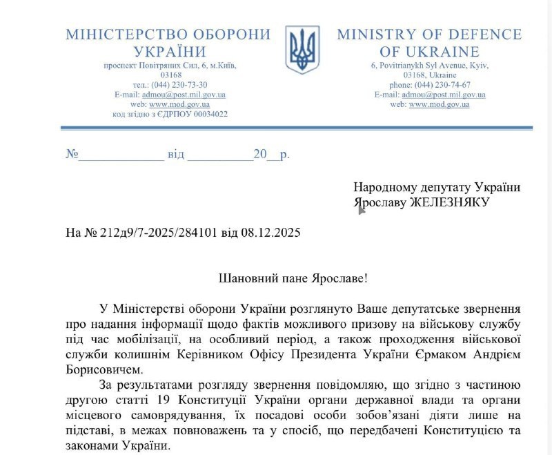 Разбираемся, что произошло с громким заявлением экс-главы ОП: ▪️ Андрей Ермак, после увольнения с поста главы ОП, громко заявлял о готовности уйти добровольцем на фронт. Однако никаких реальных шагов не предпринял. ▪️ Минобороны Украины, отвечая на запрос депутата Железняка, подтвердило: Ермак ни разу не обращался в военкоматы – ни по мобилизации, ни по контракту. ▪️ Официальный ответ ведомства четко указывает: на момент проверки Ермак не выражал желания служить в армии во время особого периода. Подписывайся