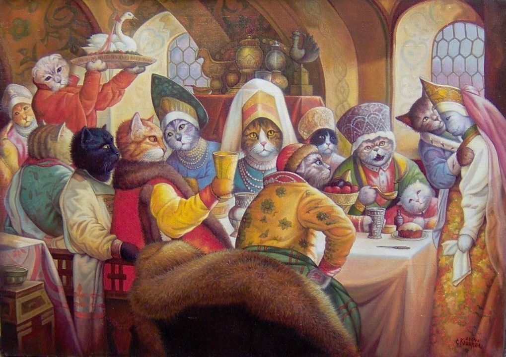 Художник, Степан Каширин. "Свадьба" (50x70см.) Холст, масло. Ниже, публикации этой картины в журнале Герцогства Люксембург и в Российском журнале "Кот и пёс".