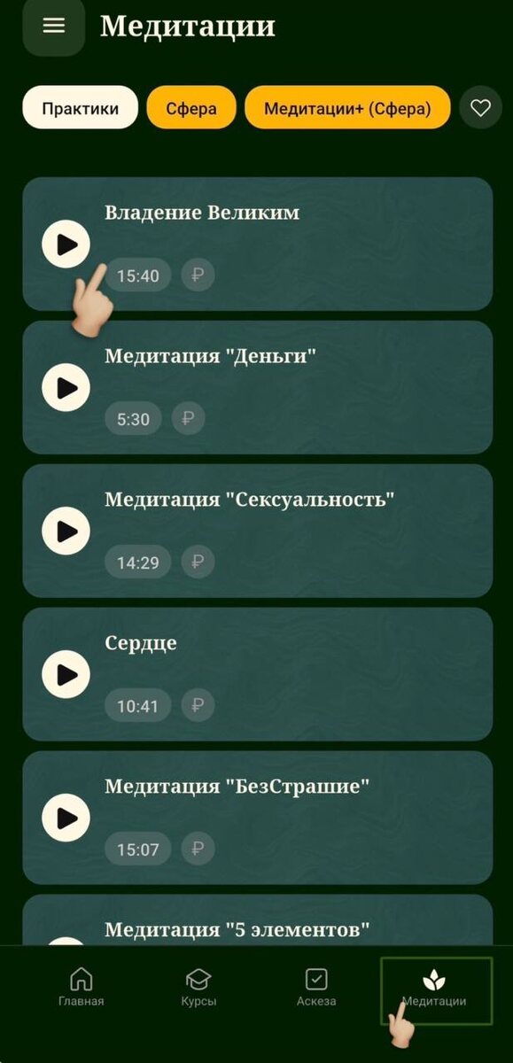 Приложение «Сфера» → Медитации → Практики → Кликните на интересующую вас медитацию, а затем нажмите ▶️ Слушайте, выбирайте и меняйте свое Состояние 🤍 СКАЧАТЬ ПРИЛОЖЕНИЕ «СФЕРА» Erid: 2VtzqupGLG3