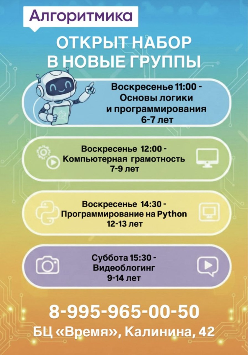 🚀 Открыт новый набор в международную школу программирования «Алгоритмика» 📅 Расписание групп: 🔹 Воскресенье 11:00 Основы логики и программирования — 6–7 лет 🔹 Воскресенье 12:00 Компьютерная грамотность — 7–9 лет 🔹 Воскресенье 14:30 Программирование на Python — 12–13 лет 🔹 Суббота 15:30 Видеоблогинг — 9–14 лет 📍 БЦ «Время», ул. Калинина, 42 📞 Запись: 8-995-965-00-50