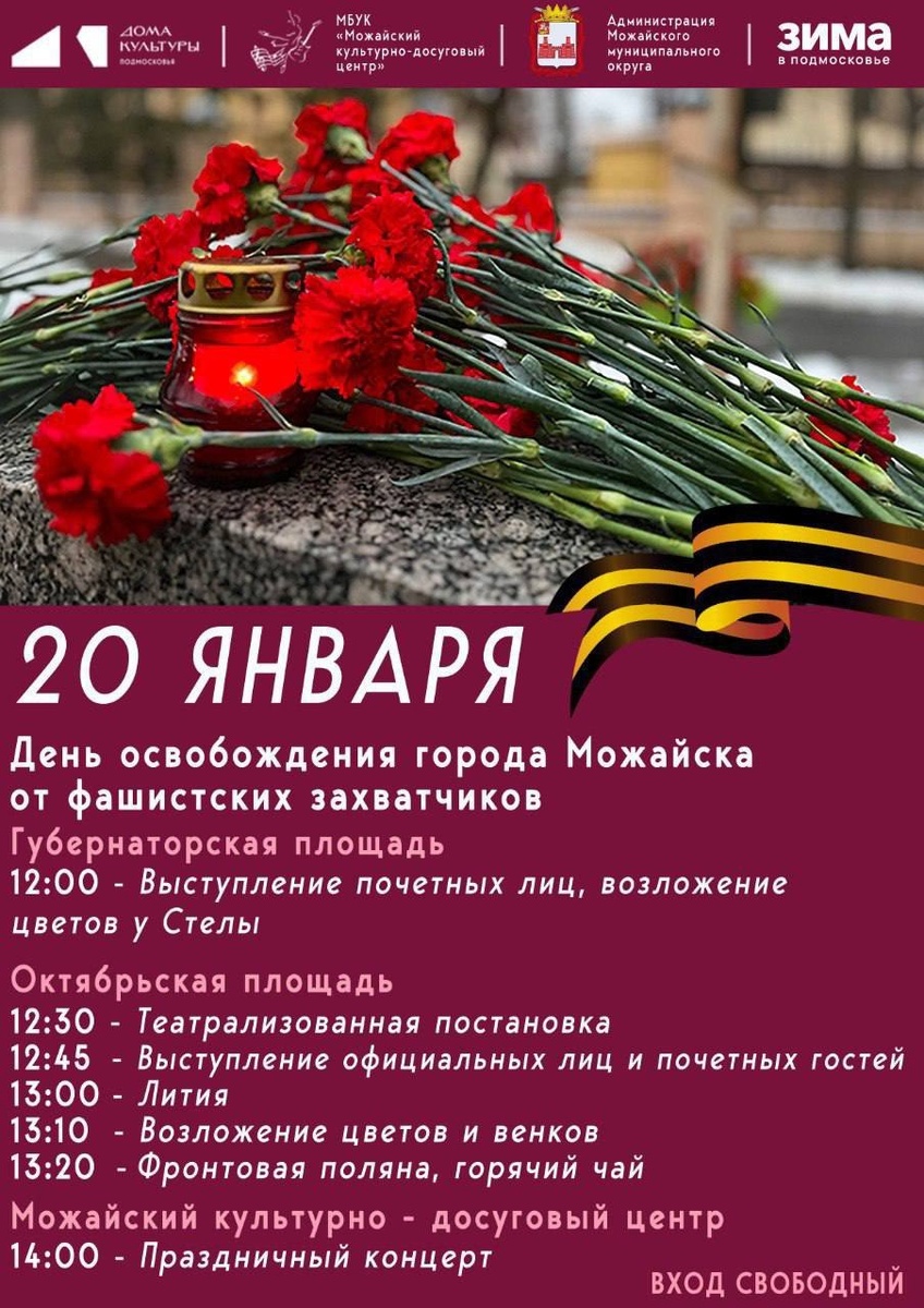 В этот день в 81 год назад город был освобожден от врага ценой невероятного мужества и стойкости. Программа дня: 📍 Губернаторская площадь, 12:00 Возложение цветов у стелы «Город воинской славы». 📍 Октябрьская площадь, 12:30 Театрализованная постановка, лития, возложение цветов и венков. 📍 Можайский КДЦ, 14:00 Праздничный концерт с участием творческих коллективов. 📍Выставочный отдел КДЦ, 15.00 Открытие фотовыставки «Можайск. Январь сорок второго».