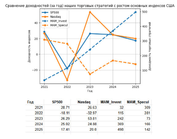 Всем добрый день и позитивного настроения! Мы с нашей командой плавно возвращаемся в рабочий режим после всех новогодних праздников И первые аналитические материалы и обзоры по рынкам начнём публиковать уже завтра А пока, для вашего удобства, мы подготовили единую табличку и нарисовали простой график 📈 на тему: Сравнение доходностей (за год) наших торговых стратегий с ростом основных индексов США Задать интересующий вас вопрос можно нашему коллеге в телеграм✔️ Ссылки на другие наши отчёты и актуальную информацию легко найти здесь📍(подать заявку на вступление в закрытый канал) Всем продуктивного нового 2026 года! Удачных инвестиций!