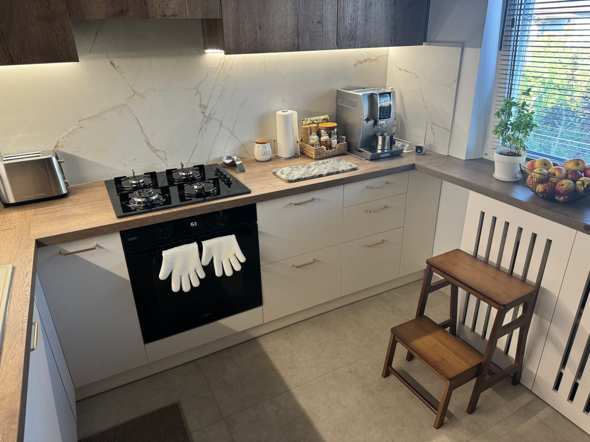 Маленькая кухня тоже может быть одновременно элегантной и функциональной. На площади всего 6,5 м² дизайнеры смогли создать пространство, которое впечатляет гармонией, стилем и продуманной практичностью. Центральный акцент — белый мрамор с золотыми прожилками между мебелью. Он не только придает кухне изысканность, но и органично соединяет все элементы интерьера. Плитка на стенах — Museum Dual White NT 60x120 см с матовым финишем. Благодаря высочайшему классу устойчивости к пятнам она прекрасно подходит в качестве backsplash, защищая стены от брызг и легко очищается. Пол оформлен песочной плиткой Materika Sand 60x120 см с антискользящей поверхностью класса R10. Бетонная текстура с деликатными прожилками не только визуально успокаивает интерьер, но и делает загрязнения менее заметными — дополнительный плюс для маленькой кухни, где функциональность важна на каждом сантиметре. Цветовая гармония продумана до деталей: золотые прожилки мрамора идеально сочетается с теплым бежевым полом, созд
