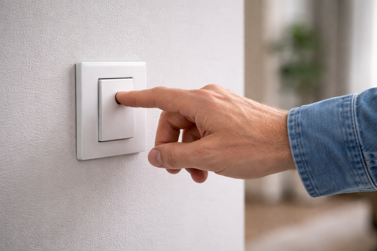 Мастер-выключатель — как раз из первой категории. Ниже разберём, почему. Мастер-выключатель — это один выключатель у входа, который управляет электропитанием всей квартиры или дома. При его выключении гаснет свет, обесточиваются розетки, отключается техника. При этом важные линии остаются включёнными: То есть вы уходите, а дом остаётся безопасным, но не «обесточенным вслепую». Вся логика находится в электрощите. Там