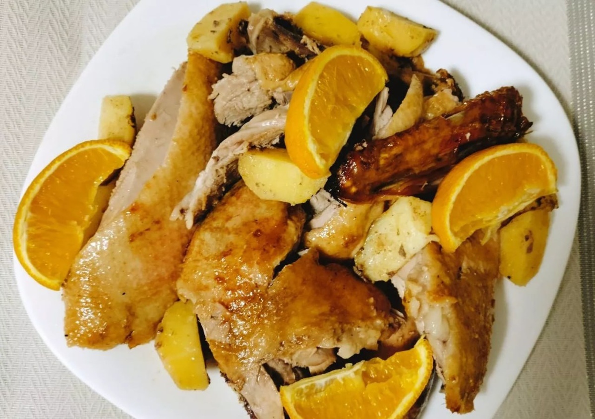 📖 Ингредиенты: * Утка (целая) — 2–2,5 кг. * Апельсины — 3 шт. * Картофель — 800 г. * Мёд — 2 ст. л. * Соевый соус — 4 ст. л. * Чеснок — 4 зубчика. * Розмарин — 2 веточки. * Соль — 1 ч. л. * Чёрный молотый перец — ½ ч. л. * Растительное масло — 1 ст. л. 🧑🏻🍳 Приготовление: 1. Утку тщательно промойте, удалите остатки перьев, обсушите бумажным полотенцем. 2. Приготовьте маринад: смешайте сок 2 апельсинов, мёд, соевый соус, измельчённый чеснок, соль, перец и растительное масло. 3. Натрите утку маринадом снаружи и внутри. Оставьте в холодильнике на 4–6 часов (лучше на ночь). 4. Картофель очистите и нарежьте крупными дольками. 5. Оставшийся апельсин нарежьте толстыми кружочками. 6. В брюшко утки поместите кружочки апельсина и веточки розмарина. 7. Выложите утку в форму для запекания, вокруг разложите картофель. Полейте оставшимся маринадом. 8. Накройте форму фольгой и запекайте в разогретой до 180 °C духовке 1,5 часа. 9. Снимите фольгу, увеличьте температуру до 200 °C и запекайте ещё