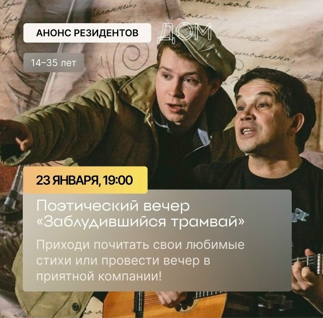 » Центр добрососедства театров «Дом» приглашает на поэтический вечер, где можно прочитать собственные стихи или произведения любимых авторов, а также просто быть слушателем. Профессионализм не обязателен, важно желание поделиться частью души. В этот раз участников ждет путешествие по странам и городам: стихи о дальних краях проведут по самым разным маршрутам. Как и всегда, тема условна – трамвай может свернуть куда угодно! Интересно, куда заведет этот путь на этот раз? 🗓️ 23 января | 19:00 📍Ул. Мончегорская, 10Б, МП «Дом» 🎟 Регистрация здесь! До встречи на остановке!