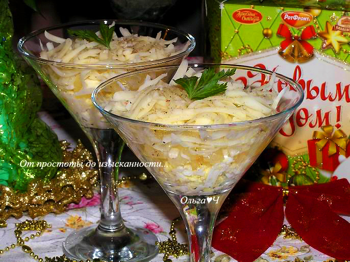 петрушка для подачи Приготовление: Яйцо натрите на терке, разложите в два небольших бокала, посолите, поперчите. Добавьте кусочки ананаса. Для соуса смешайте майонез и ананасовый сироп. Полейте салат. Сверху выложите тертый сыр, поперчите и украсьте петрушкой и подавайте. Приятного аппетита! Вам также могут понравиться: