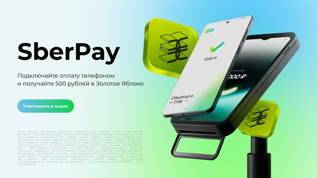 Сбер продлил до 31.01 акцию, по которой можно получить 500₽ сертификатом в Золотое яблоко за подключение сервиса SberPay и оплату покупки на 1₽ по NFC по этой ссылке Карту заказывать не надо — работает с той, что уже есть. SberPay — это бесконтактная оплата телефоном вместо пластика. Подключаете через приложение, привязываете карту «Мир», и можно платить одним касанием. Заодно в телефоне хранятся все бонусные карты, виден баланс перед оплатой, начисляются бонусы. Правила акции Что нужно для участия: Важно: акция доступна для клиентов, у которых не было покупок со SberPay NFC в течение 3 месяцев.