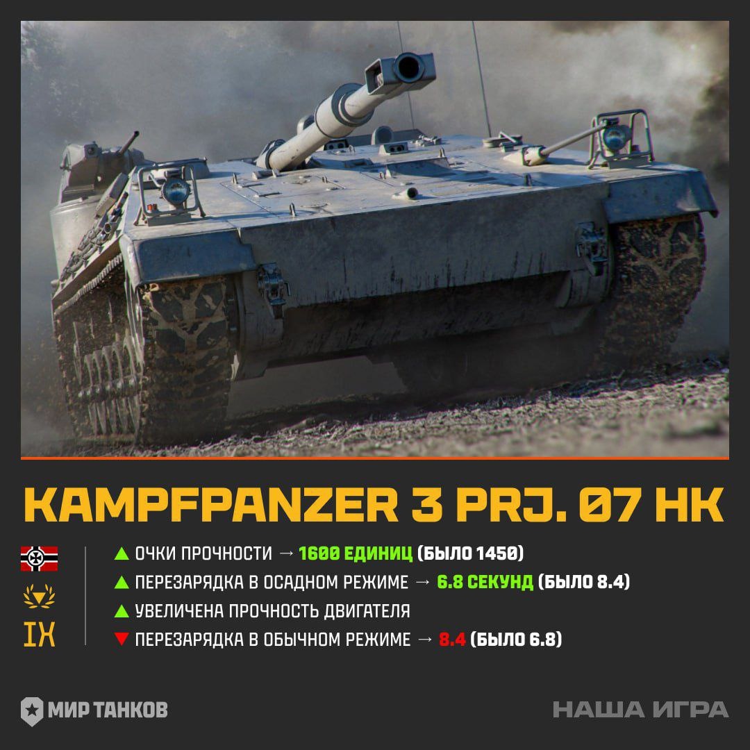 ⬇️ ㅤ 🇫🇷 Французский наградной ТТ IX уровня Lorraine 50 t: 🔼 Броня лба башни над маской орудия — 240 мм (было 190), 🔼 Перезарядка орудия — 11.5 с (было 14), 🔼 Время сведения — 2 с (было 3), 🔼 Стабилизация от движения и поворота корпуса улучшена на 25%. ㅤ 🇨🇳 Китайский наградной ТТ IX уровня BZ-58-2: 🔼 Броня ВЛД — 100 мм (было 70), 🔼 Броня бортов корпуса — 80 мм (было 70), 🔼 Броня НЛД — 90 мм (было 75). ㅤ ➿ Советская наградая ПТ-САУ IX уровня К-91-ПТ: 🔼 Урон от выстрела — 420 ед (было 390), 🔼 Время сведения — 2,3 с (было 2,6), 🔼 Боекомплект — 40 снарядов (было 30). ㅤ 🇩🇪 Новые ТТХ немецкой наградой ПТ-САУ IX уровня Kampfpanzer 3 Prj. 07 HK найдёте на картинке поста! ㅤ ⬇️ Чей ребаланс понравился больше? 👍 — за Lorraine 50 t ❤️ — за BZ-58-2 🔥 — за К-91-ПТ 🙏 — за Kampfpanzer 3 Prj. 07 HK