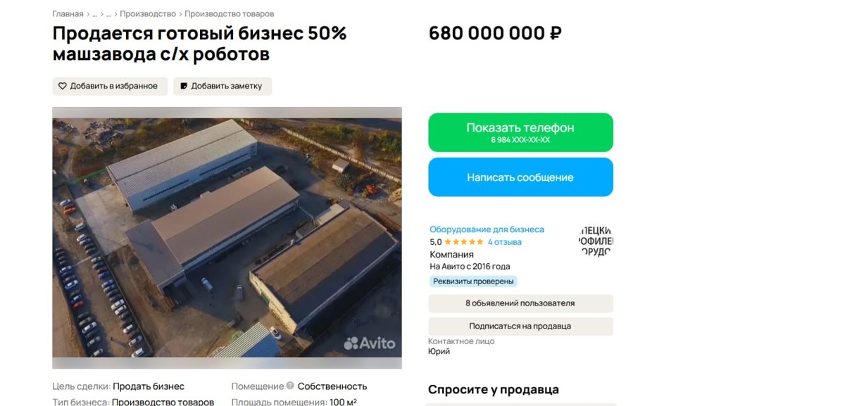 ». Доля 50% в предприятии по производству сельскохозяйственных роботов выставлена на продажу в Липецке. Стоимость объекта — 680 млн рублей, продавцом выступает «Липецкий завод профилегибочного оборудования» (ООО «ЛЗПО»). В объявлении утверждается, что прототипы сельскохозяйственных роботов, планируемых к производству на заводе, уже разработаны и протестированы. Также, по заявлению продавца, на предприятии планируется модернизация, которая позволит достичь выпуска продукции на сумму около 3,5 млрд рублей с потенциалом роста. Предполагаемые рынки сбыта включают Россию, Белоруссию, Казахстан и Иран. ООО «ЛЗПО» демонстрирует низкую финансовую активность — по данным Rusprofile, в 2024 г. компания не получила ни выручки, ни прибыли. В 2021 г. выручка составляла 75 млн руб., а убыток — 3,3 млн руб. ПроТрактор | Сельхозтехника