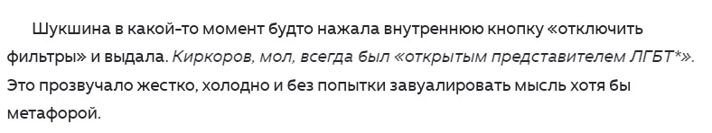 Разумеется, никакую тайну нам Шукшина не открыла (кстати, зачем вообще "открывала"??) мы все давно в курсе грязных слухов. Мы даже можем их сопоставить с реальностью и увидеть некоторые совпадения... Зато на выпады от Шукшиной от Киркорова не поступило никакого ответа. И это замечательно! Должен же хоть кто-то в этой ситуации повести себя достойно!