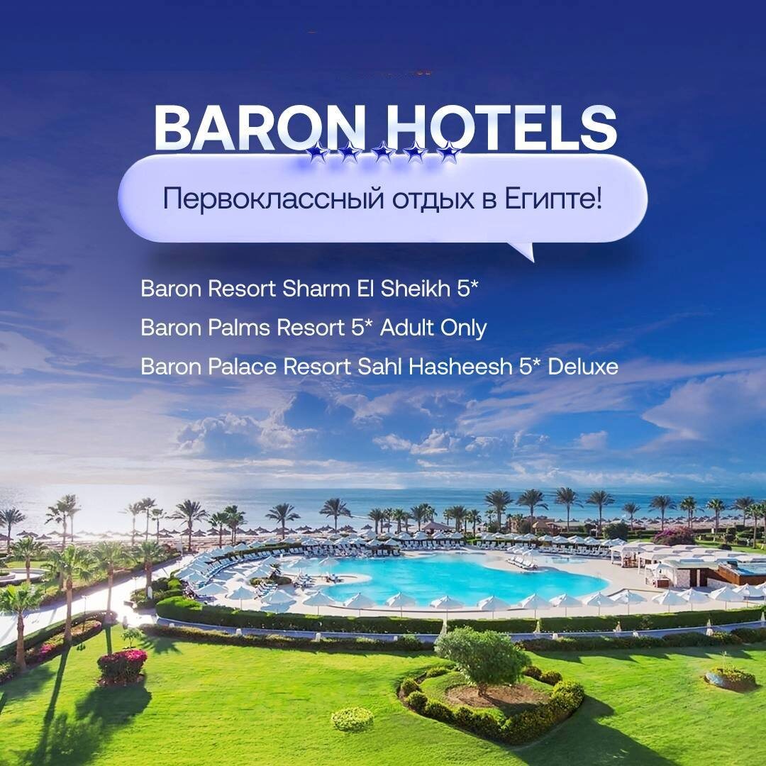 Сеть отелей Baron в Египте известна высоким уровнем сервиса и спокойной атмосферой. Отдыхающих ждут ухоженные пляжи, разнообразное питание и комфортные номера. Отели Baron подойдут как для семейного отдыха, так и для пар, ценящих комфорт и качество. Отели сети отличаются вниманием к деталям и хорошей организацией отпуска. 🌴 Baron Resort Sharm El Sheikh 5☆ Удостоенный наград отель идеально подходит как для отдыха пар, так и для семей. Для размещения предлагаются элегантно обставленные просторные номера и люксы с собственными террасами или балконами. В Health Club & Relaxation – широкий спектр процедур и массажей. Маленькие гости смогут весело провести время в детском клубе. 🌴 Baron Palms Resort 5☆Adult Only Отель, дизайн которого выполнен в андалузском стиле, работает по системе Adults Only 16+. Курортный отель расположен в бухте Рас-Насрани, близко к заповедной зоне с лучшим местом для дайвинга. Гости могут отдохнуть на превосходном песчаном пляже и насладиться красивой зеленой