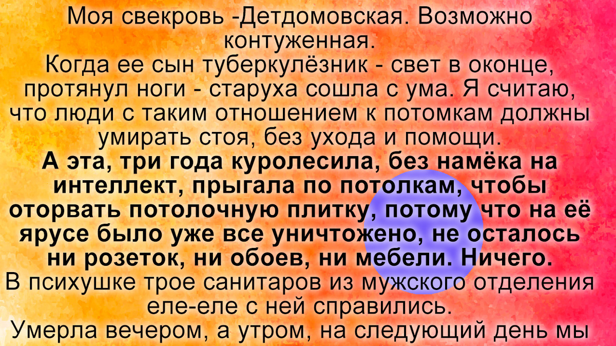 А потом. Её Туберкулёзник на небеса, а старуха сошла с ума. Я считаю, что люди с таким отношением к потомкам должны умирать стоя, без ухода и помощи. А эта три года куролесила, без намёка на интеллект, прыгала по потолкам, чтобы оторвать потолочную плитку, потому что на её ярусе было уже все уничтожено, не осталось ни розеток, ни обоев, ни мебели. Ничего.