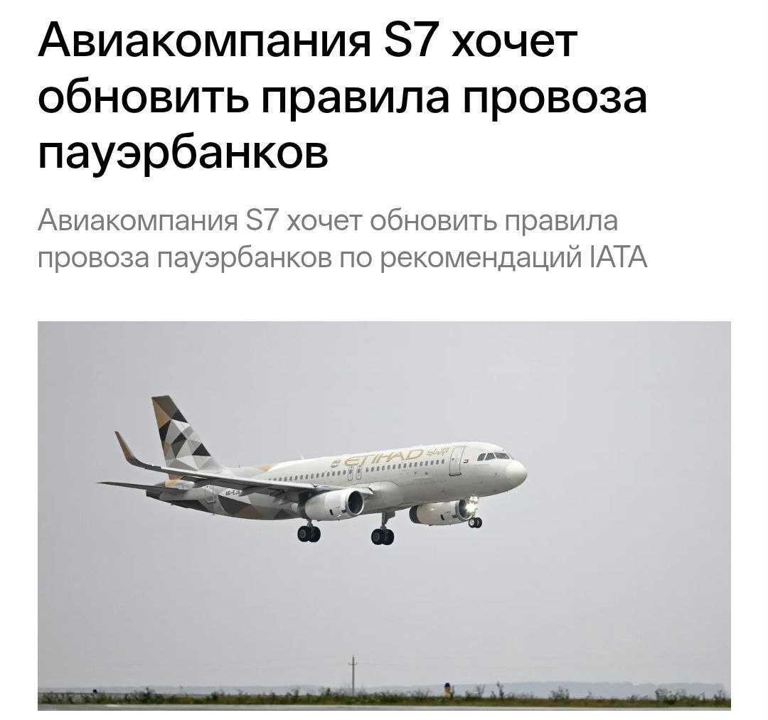 Авиакомпания S7 готовит новые правила: использование пауэрбанков на борту будет запрещено. Пауэрбанки нельзя будет размещать на багажных полках и использовать во время руления, взлёта и посадки. Зарядка устройств в эти периоды будет недоступна. Ожидается ужесточение мер безопасности при перевозке портативных аккумуляторов. https://dzen.ru/id/5c0e38ff46ef5c00aaa80527