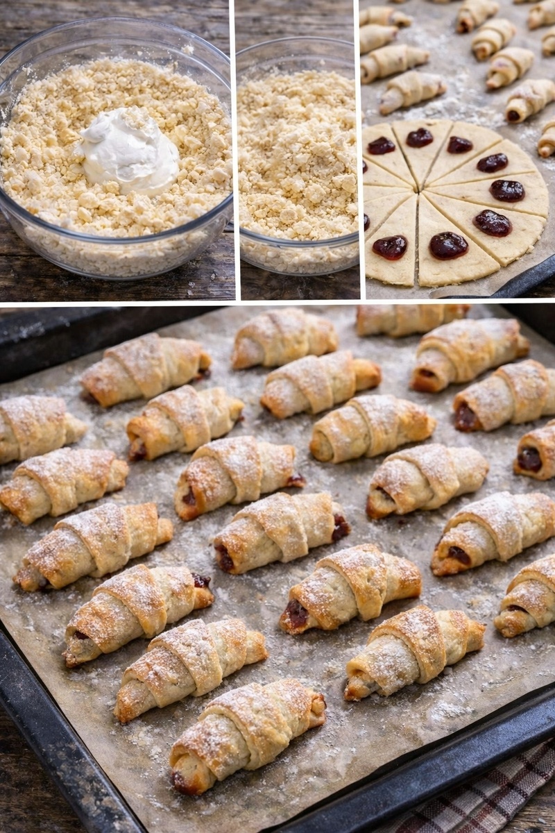 5. На широкий край каждого треугольника выложите по 0,5–1 ч. л. повидла и сверните рогалики.