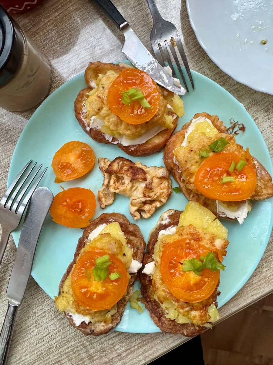 По быстрому гренки с творожным сыром, поджаренным картофельным оладушком, куриной котлеткой и помидоркой.