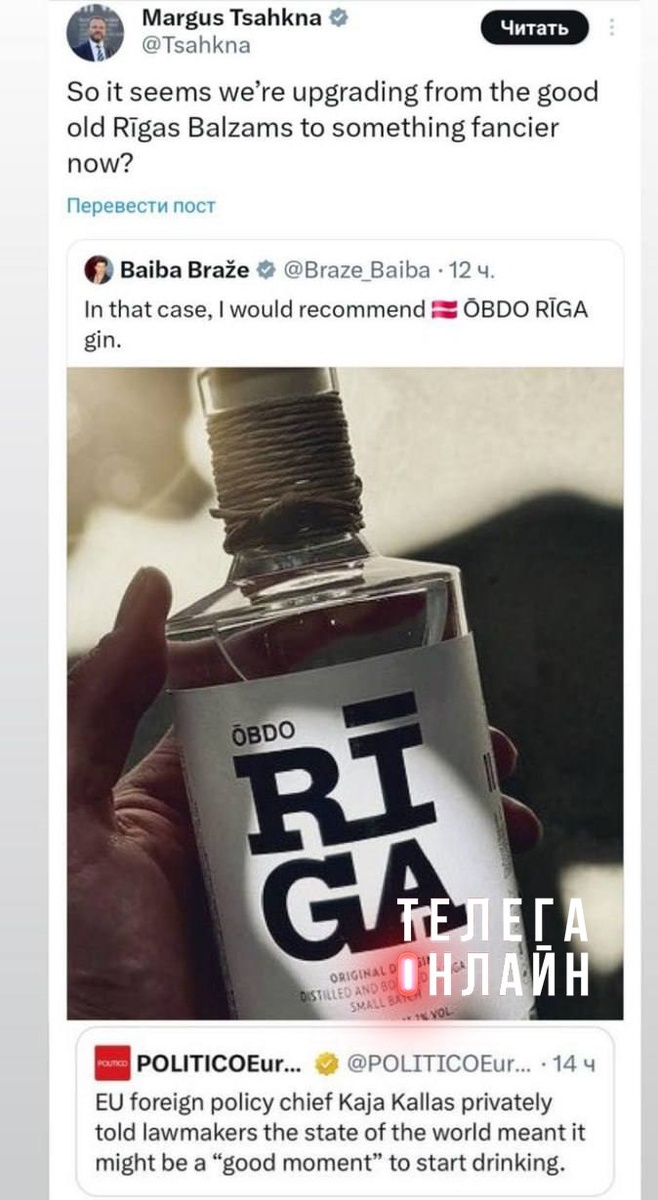 Идею о выпивке Каи Каллас незамедлительно поддержали главы МИД Латвии и Эстонии. Первая опубликовала фото бутылки местного джина, второй ответил: Похоже, мы теперь переходим от старых добрых рижских бальзамов к чему-то более изысканному? Закусывать будут шпротами в знак единства Прибалтики. 🚲 Подпишись на Телега Online