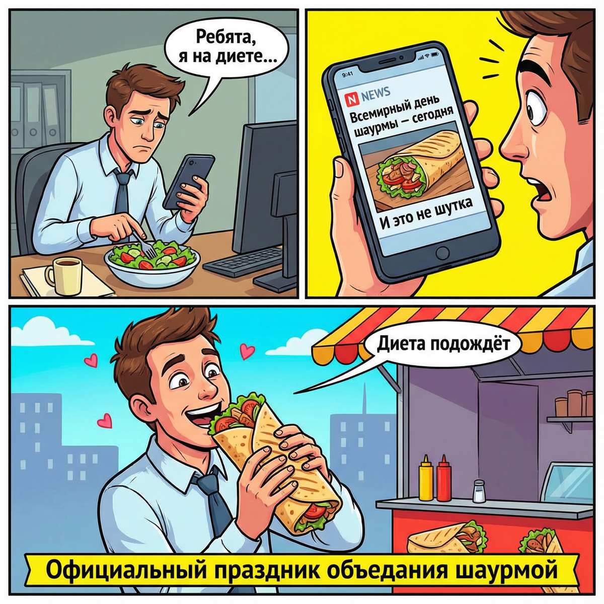 Самое странное в Дне шаурмы — никто точно не знает, кто его придумал. Нет ни организации, ни документа, ни даже внятной истории. Праздник просто появился в интернете и начал жить своей жизнью.