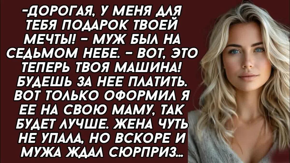 — Дорогая, я тут подумал и всё решил. Я оформил нашу машину на мою маму. Но платить за кредит ты будешь, конечно, сама, как и планировала. Ну, и я добавлю, если что останется.