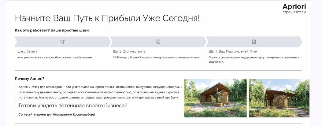 ? Проведём бесплатный аудит и поможем повысить эффективность вашего бизнеса. Один из директоров «Априори», Игаль Зонов, проведет анализ, выявит слабые стороны и даст практические рекомендации. Это касается всех аспектов: маркетинга, внутренних процессов и любых других сфер деятельности. Даже если вам кажется, что вы уже всё изучили и проверили, всегда есть риск что-то упустить. Взгляд стороннего эксперта будет полезен в любом случае. Один из обратившихся уже подчеркнул для себя ценные мысли. Начните ваш путь к прибыли уже сегодня, связавшись по контактам: Телефон: +74957981414 Телеграм @apriorib2b #отельныйбизнес #бесплатныйаудит
