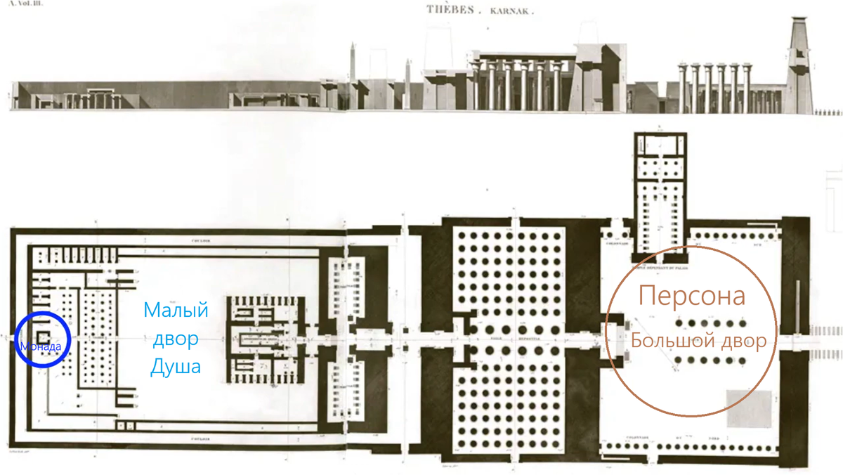 Этот луч света является каналом, по которому будет происходить окончательное отступление Монады. Когда Монада ниспослала Нить Жизни, это был инволюционный процесс в сторону сосредоточения на Душе и Персоне. Построение Антахкараны – это обратный процесс, посредством которого Монада абстрагируется от двух нижних триад. Этот процесс называется «Великим Отречением». От чего же отрекаются? От жизни Персоны и Души, которые были инструментами для достижения более высокой цели. В этом и заключается суть 4-го посвящения (i4). Антахкарана служит не только процессу объединения 1-й и 2-й триад, но и возвращению к Монаде, расположенной над 3-й триадой. После прохождения (i4) Душа и Персона больше не имеют власти над учеником. Именно тогда, как уже упоминалось, «завеса Храма» разрывается на две части сверху донизу. Именно эта завеса отделяет внешний двор, жизнь Персоны, от Святилища, Души, и далее – от Святая Святых, Монады. Мы видим это в строительстве Иерусалимского храма. Я же думаю об этом скорее через призму Карнакского храма в Египте. Меня всегда поражало, как у входа в него находится огромное здание, которое затем переходит в меньший двор. А оттуда – в небольшую комнату, где стоит статуя высотой всего около 30 сантиметров. Столько каменной кладки ради простой статуи размером с куклу! Но, в конце концов, мы говорим о монаде. Монада – это мельчайшая частица материи во Вселенной. Она может быть всемогущей, но заключена в крошечной оболочке. Теперь аналогия со зданием и тем, что мы здесь обсуждаем, кажется вполне понятной.