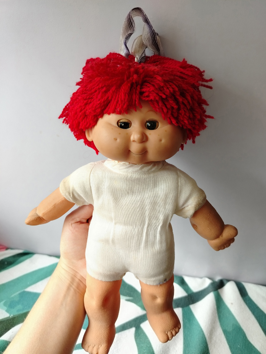 Это уже четвертая кукла, которую я покупаю в сэконде. Ну не могу пройти мимо потрепанных жизнью игрушек. Тем более, что она мне очень сильно напомнила Cabbage Patch Kids, которых у нас в стране никогда не было. Вот такая чумазая рыжулька с волосами из ниток. Глазки открываются/закрываются, но один немного подизносился. Взяв ее в руки, я почувствовала, что куколка была, прямо-таки, любимой, что с ней охотно играли. Бывают игрушки с такой теплой аурой любимых вещей. Поэтому решила дать ей, как минимум, вторую жизнь. На шее оказалось клеймо b.b. Made in Spain, но его я разглядела уже дома. Куколка отправилась на спа-процедуры (на этом фото хорошо видно, насколько она грязная): Я, тем временем, решила поискать, что за девочка такая. И, с удивлением, обнаружила, что это - самый настоящий винтаж 1980х годов. И, действительно, замахивались испанцы на "Деток с капустной грядки". А вот моя мини мадам уже после помывки и просушки, пахнущая моим дорогим кондиционером для волос: Сохранилась она хо