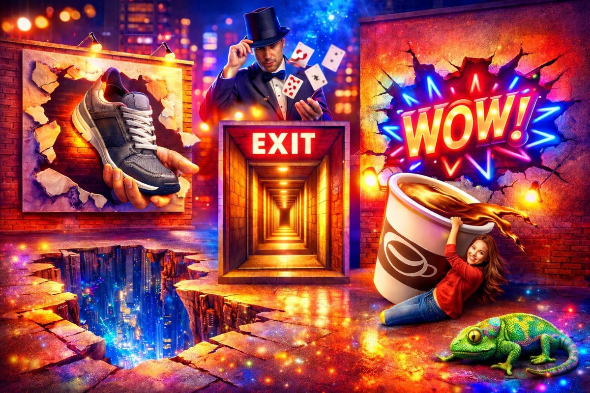 Если бы маркетинг был шоу, то мы бы точно сидели рядом с «Четырьмя всадниками» из фильма «Иллюзия обмана» и готовили следующий эффектный трюк. Зрители бы удивлённо вскидывали брови, а мы только загадочно улыбались: «Смотрите внимательнее… или как раз НЕ смотрите — так интереснее!» В рекламе работает тот же принцип: Чуть-чуть иллюзии, немного света, правильный акцент — и обычная реклама превращается в вау-момент, который хочется рассматривать, фотографировать и обсуждать. 🎩 Почему иллюзии работают в наружной рекламе? Помните фразу из фильма: «Чем внимательнее смотришь — тем меньше видишь»? Реклама не должна просто сообщать — она должна удивлять, «отвлекать внимание», как фокусник, и заставлять людей посмотреть снова. 1. Мозг любит «допридумывать» Простой баннер, сыгранный перспективой, может превратиться в 3D-эффект. Легко, чисто, эффектно. Мозг увидел — поверил — запомнил. 2. Иллюзия = эмоция Вывеска, которая выглядит так, будто сейчас упадёт? Печать, создающая эффект глубины? Неон,