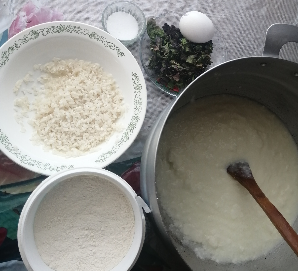После чего, рис и муку добавлять к кефиру с яйцом и перемешать, чтобы не было комочков.